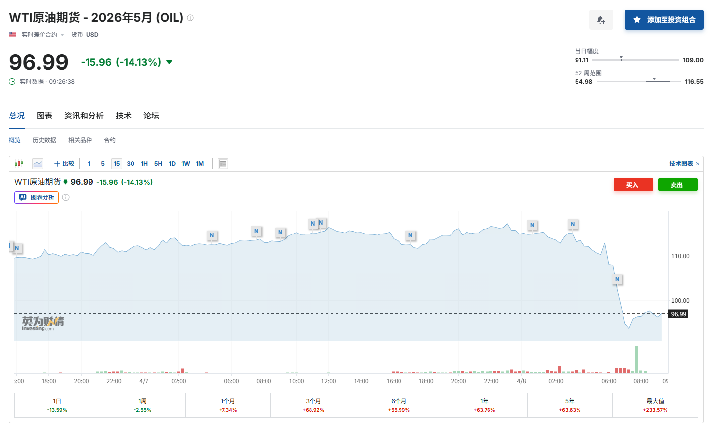 受此消息影响,美国三大股指期货盘后均涨近2%,其中纳指期货涨幅一度扩大至近3%。而国际油价则应声大跌:布伦特原油期货和西德克萨斯中质原油期货一度下跌约16%,截至发稿,跌幅均略有收窄。