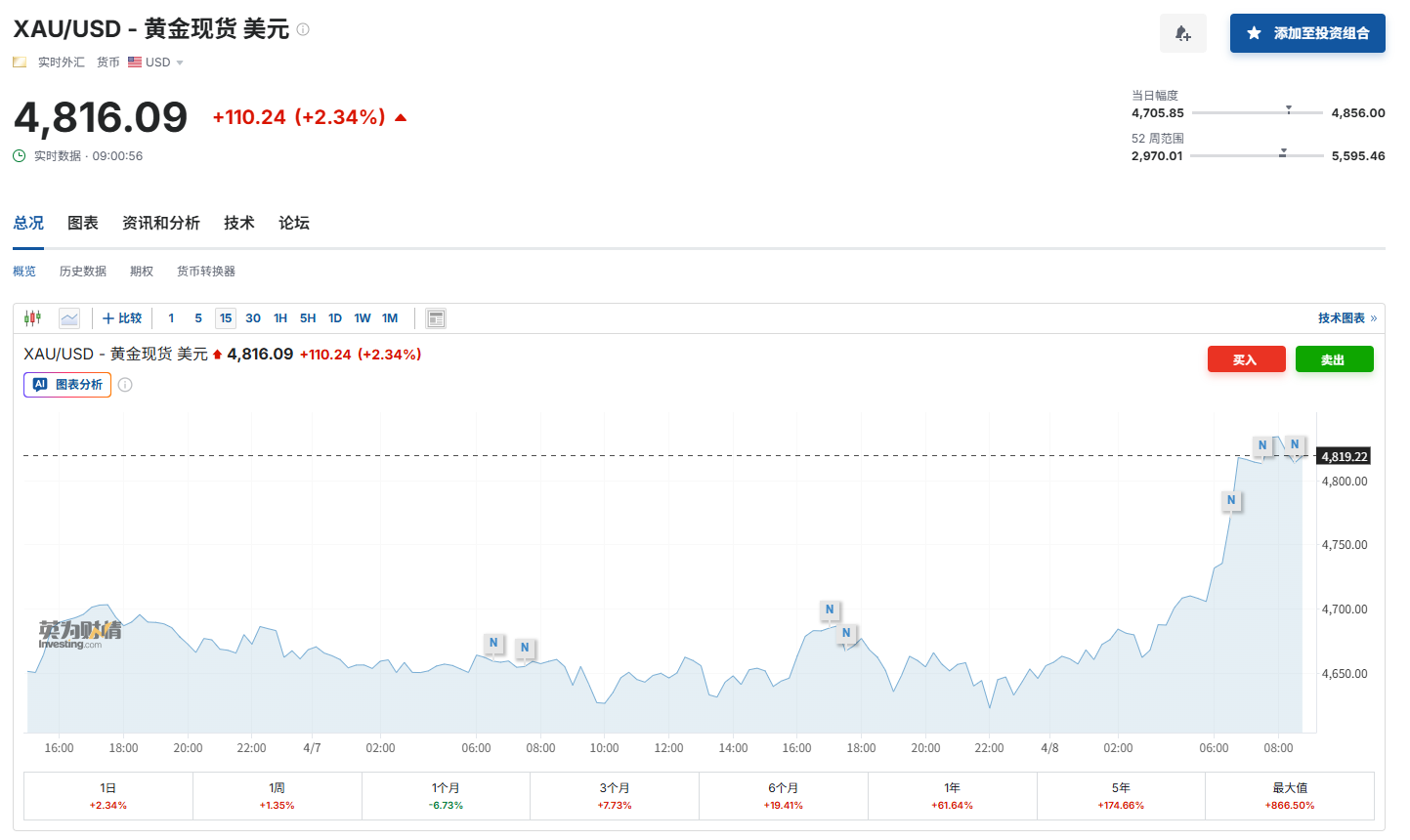 贵金属在早盘交易中上涨:国际现货黄金大幅冲高,日内一度触及4857.46美元/盎司,截止发稿,涨幅略微收窄至2.34%,报4816.09美元/盎司;现货白银上涨4.2%,至每盎司76.02美元。
