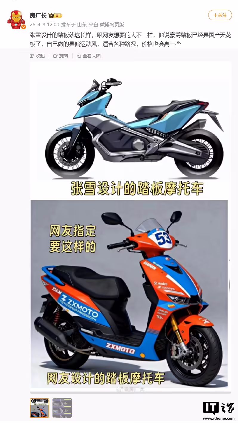 还有博主晒出了外观图,表示“张雪设计的踏板就这长样,跟网友想要的大不一样”。