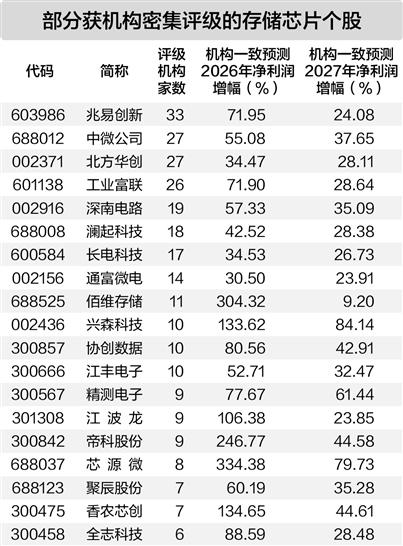 获评级机构家数最多的是兆易创新,共有33家机构评级,机构一致预测该股2026年、2027年净利润增长率分别达到71.95%、24.08%。