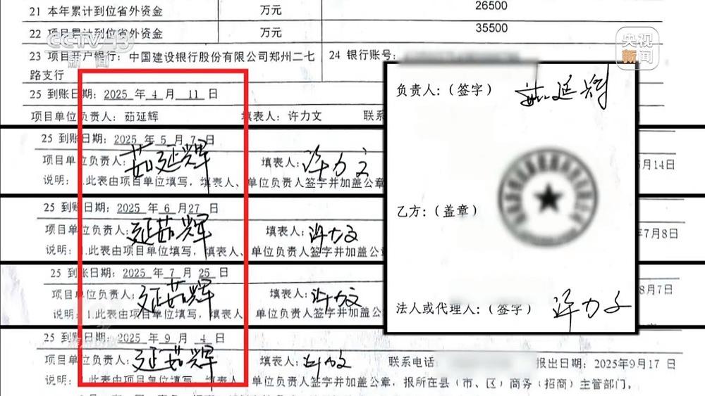 类似舞阳县的问题并非个例,在其他地区同样存在。记者在郑州市管城区商务局调查时发现,2025年4月至9月的省外资金月报表显示,一家海南企业向辖区内的河南某企业累计投资9.6亿元,但佐证材料里只有投资合同,没有对应的银行进账凭证。同时,合同和报表上的签名也漏洞百出:月报表前两页的项目负责人签名是“茹延辉”,后面几页却变成了“延茹辉”,多处字迹也明显不一样。拿着该项目的相关材料,记者找到了这家企业负责人。