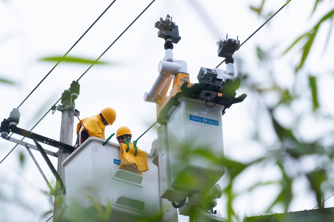 4月7日,在重庆市长寿区葛兰镇星火桥湾10千伏葛台线作业现场,带电作业人员操控一台双臂人机协同配网带电作业机器人,成功完成保电线路的引流线搭接任务,为附近农户安全灌溉提供电力保障。
