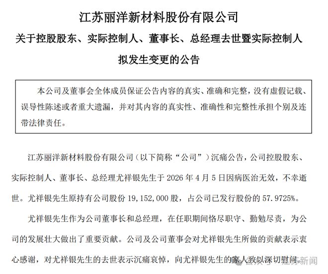 红星资本局4月9日消息,4月8日,丽洋新材发布公告称,公司控股股东、实际控制人、董事长、总经理尤祥银于2026年4月5日因病医治无效,不幸逝世。