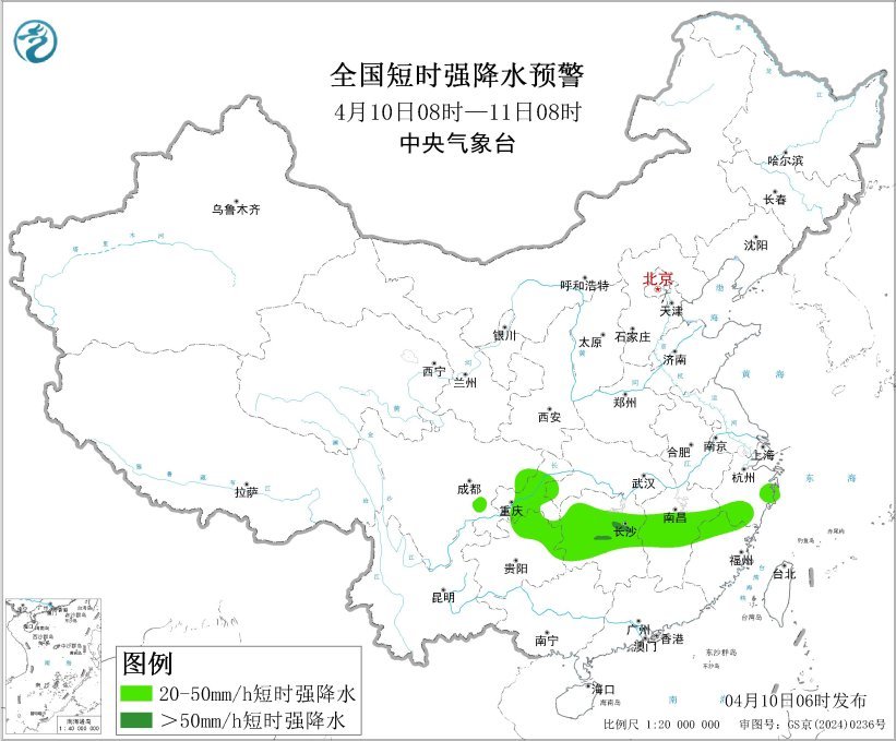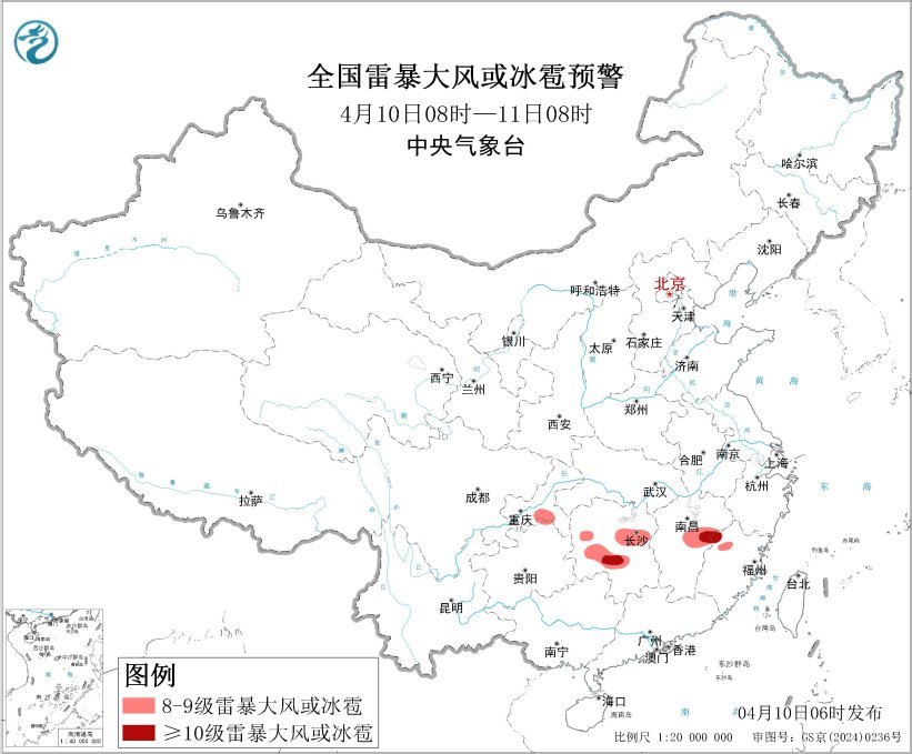 预计4月10日08时至11日08时,江南中部等地的部分地区将有8级以上雷暴大风或冰雹天气,其中,湖南中南部、江西中东部、福建西北部等地的部分地区将有10级以上雷暴大风,最大风力可达11级以上;江南中部、西南地区东北部等地的部分地区将有小时雨量大于20毫米的短时强降水天气,其中,湖南中部的部分地区小时雨量大于50毫米。