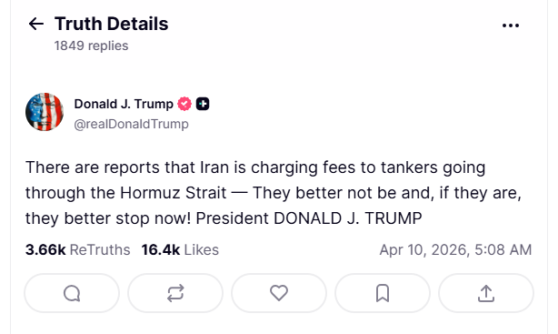 据央视新闻报道,当地时间4月9日,特朗普在其社交媒体Truth Social上发文,警告伊朗不要向通过霍尔木兹海峡的油轮收取费用。
