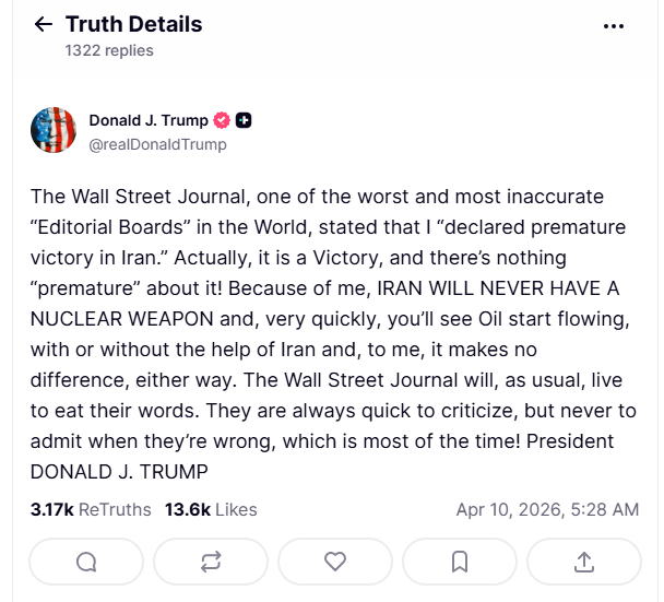 在后续的另一篇帖子中,特朗普还称,“因为我,伊朗永远不会拥有核武器,而且很快你们就会看到石油开始源源不断地涌出,无论伊朗是否参与,对我来说都无关紧要。”