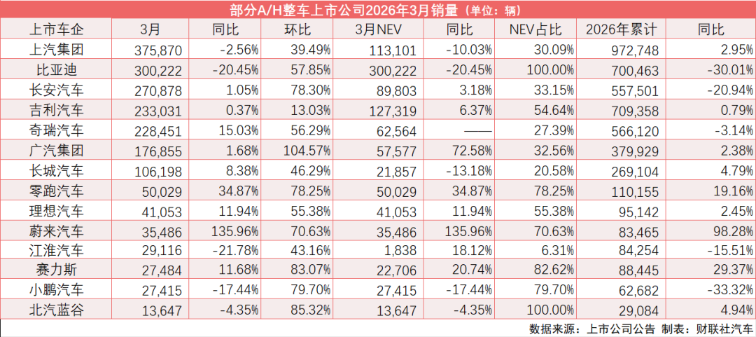 在14家上市车企中,上汽集团继续领跑,3月销量37.6万辆,今年以来实现“月销三连冠”;1-3月累计销量97.3万辆,同比增长2.95%,成为一季度行业内唯一达到百万级销量的车企集团。