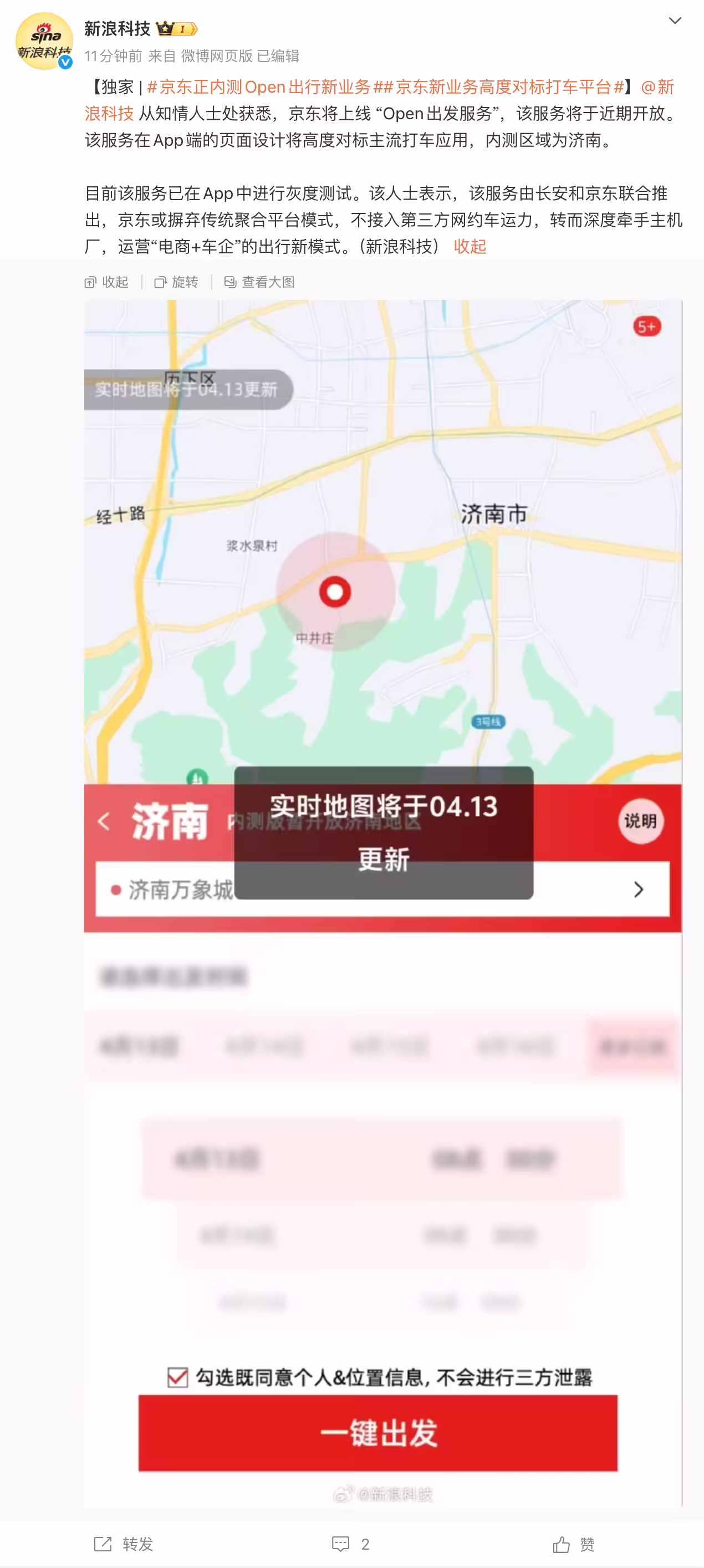 今天(4 月 10 日)上午,新浪科技援引知情人士消息称,京东新业务“Open 出发服务”将于近期开放。该服务现已在济南启动内测,在 App 端的页面设计将高度对标主流打车应用。