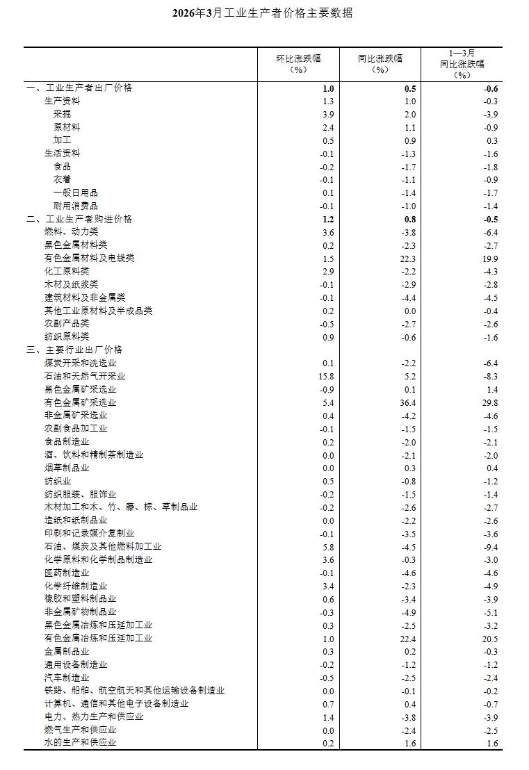 2026年3月份,全国工业生产者出厂价格同比由上月下降0.9%转为上涨0.5%;环比上涨1.0%,涨幅比上月扩大0.6个百分点。工业生产者购进价格同比由上月下降0.7%转为上涨0.8%;环比上涨1.2%,涨幅比上月扩大0.5个百分点。一季度,工业生产者出厂价格比上年同期下降0.6%,工业生产者购进价格下降0.5%。