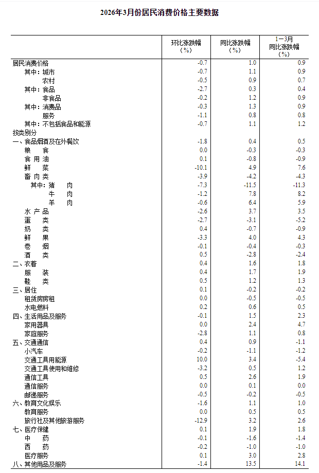2026年3月份,全国居民消费价格同比上涨1.0%。其中,城市上涨1.1%,农村上涨0.9%;食品价格上涨0.3%,非食品价格上涨1.2%;消费品价格上涨1.3%,服务价格上涨0.8%。1—3月平均,全国居民消费价格比上年同期上涨0.9%。