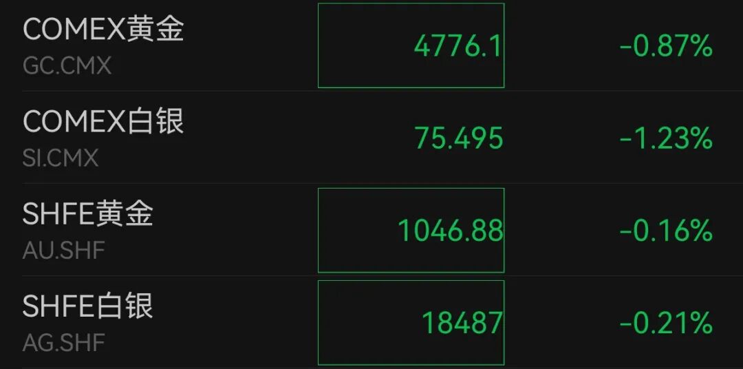 期货方面,COMEX黄金期货跌0.87%,现报4776.1美元/盎司;COMEX白银期货跌超1%。沪金、沪银同样下跌。
