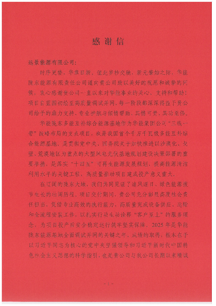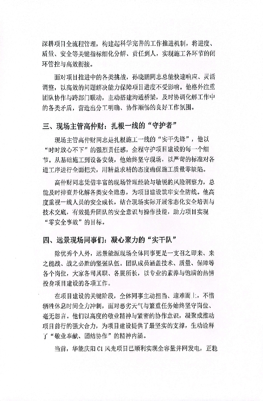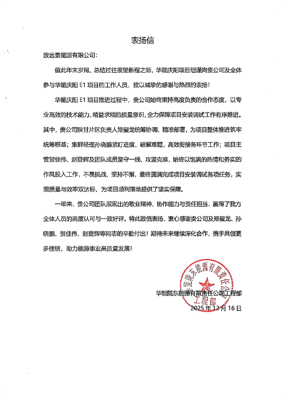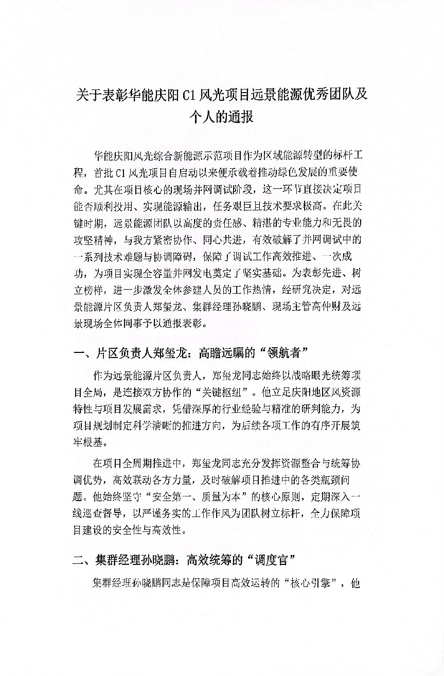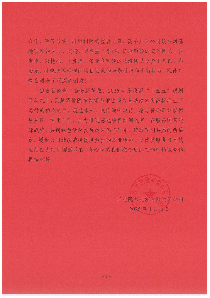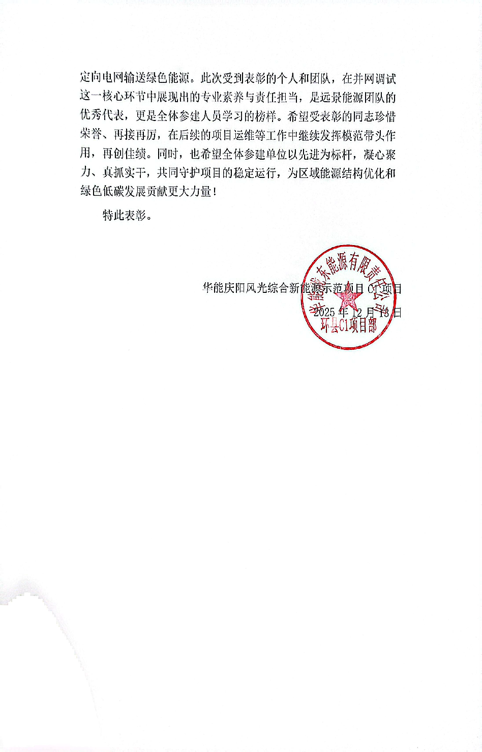 2023年6月,C1、A2、A1三个区块开工,2025年6-8月,三个区块顺利并网,创下两个月并网238台风机的行业最快并网纪录。截至2026年2月中旬,三个区块已累计发出11.36亿千瓦时绿电。2025年5月E1、E2区块开工,2026年4月6日全部吊装完成。在建设与并网的关键节点,业主单位的表扬信纷至沓来。
