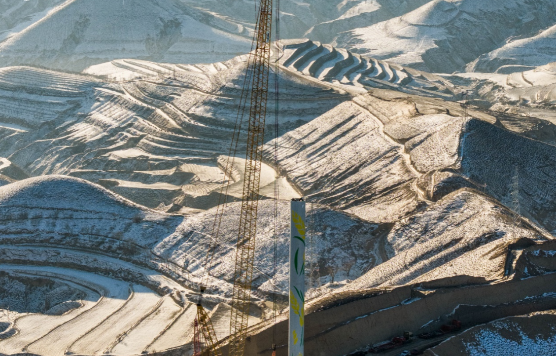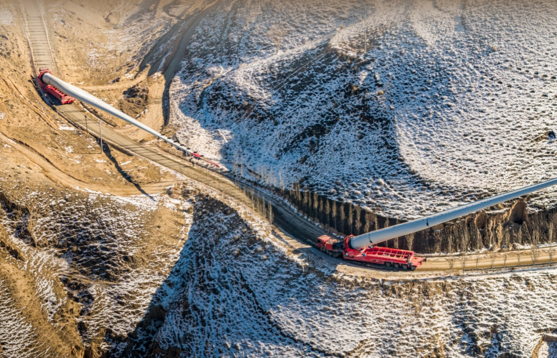 在项目现场,放眼望去是无边无际、支离破碎的黄土丘壑。所谓的“路”是依山开凿的便道,一侧是陡峭的黄土崖壁,另一侧就是深邃的沟壑,弯急坡陡,每一步都考验着运输车辆的极限性能和驾驶员的胆识。重型卡车轰鸣着,在雪后硬滑的黄土坡道上艰难爬行。长达99米的叶片,在“九曲十八弯”的山道上挪移,每一次转弯都如同一次精密的“外科手术”,需要前后车精准配合。