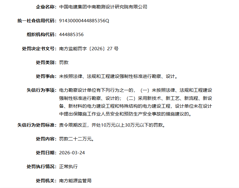 近日,国家能源局资质和信用信息系统处罚信息显示,中国电建集团中南勘测设计研究院有限公司因未按照法律、法规和工程建设强制性标准进行勘察、设计,被南方能源监管局罚款22万元。
