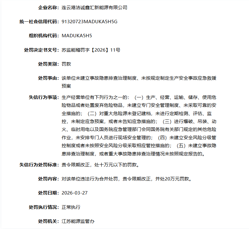 近日,国家能源局资质和信用信息系统处罚信息显示,连云港洁诚鑫汇新能源有限公司因未建立事故隐患排查治理制度、未按规定制定生产安全事故应急救援预案,被江苏能源监管办责令限期改正,并处20万元罚款。