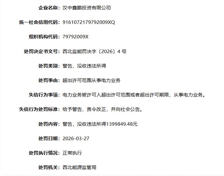 近日,国家能源局资质和信用信息系统处罚信息显示,汉中鑫鹏投资有限公司因超出许可范围从事电力业务,被西北能源监管局给予警告,并没收违法所得1399849.48元。