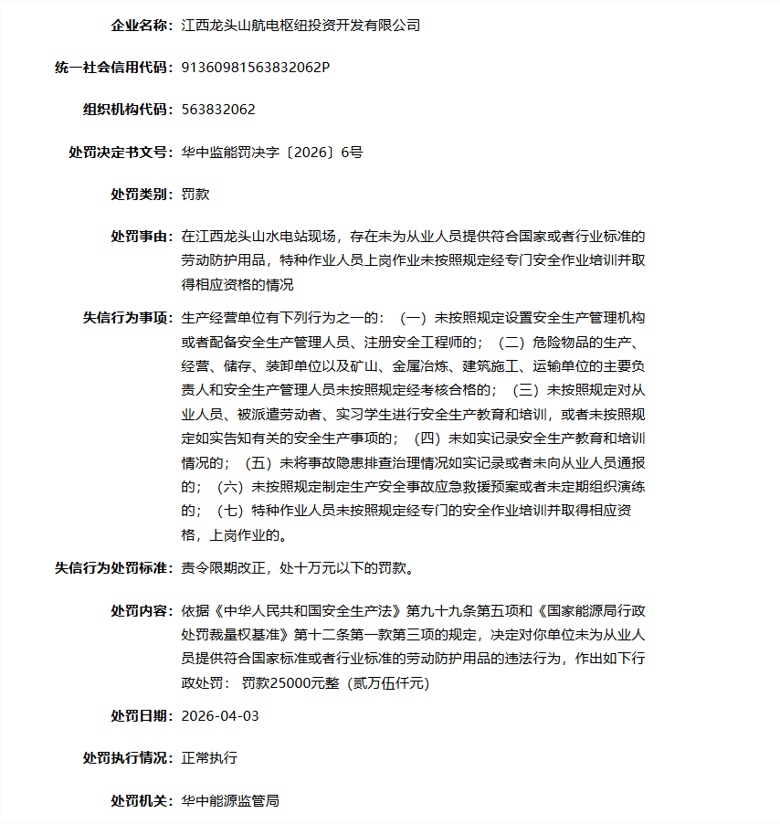近日,国家能源局资质和信用信息系统处罚信息显示,江西龙头山航电枢纽投资开发有限公司因在江西龙头山水电站现场,存在未为从业人员提供符合国家或者行业标准的劳动防护用品,特种作业人员上岗作业未按照规定经专门安全作业培训并取得相应资格的情况,被华中能源监管局罚款25000元。