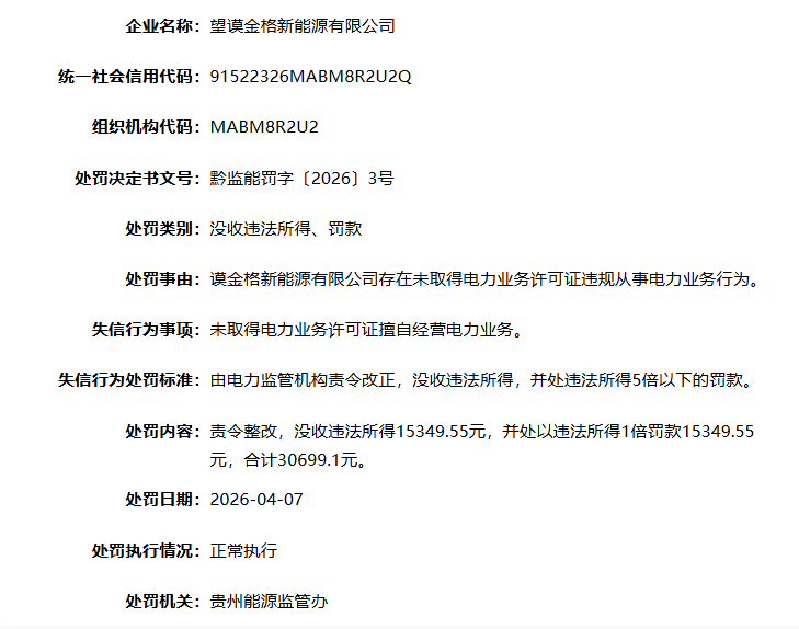 近日,国家能源局资质和信用信息系统处罚信息显示,望谟金格新能源有限公司因存在未取得电力业务许可证违规从事电力业务行为,被贵州能源监管办罚款30699.1元。