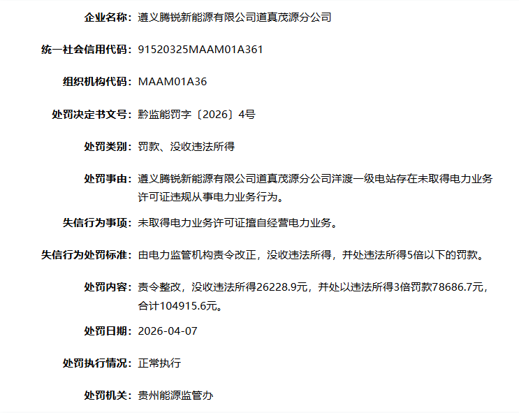 近日,国家能源局资质和信用信息系统处罚信息显示,遵义腾锐新能源有限公司道真茂源分公司因洋渡一级电站存在未取得电力业务许可证违规从事电力业务行为,被贵州能源监管办罚款104915.6元