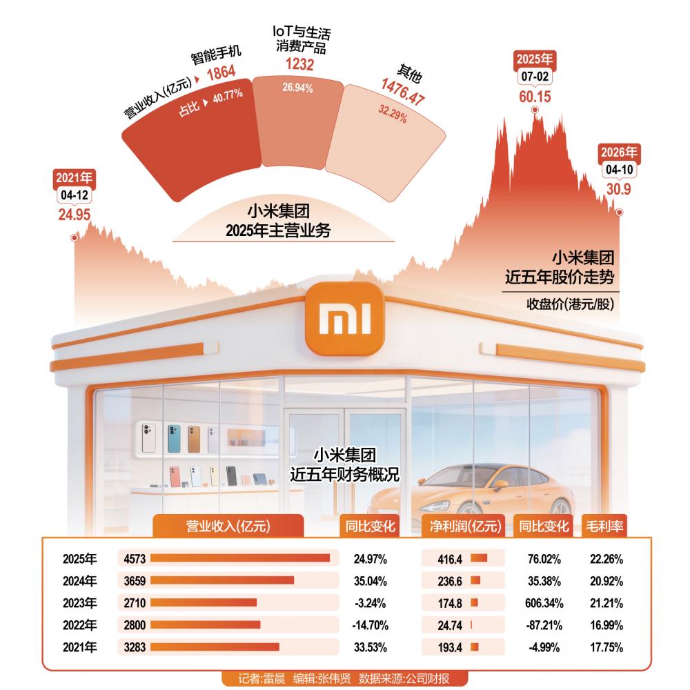 支撑这一轮上涨的是实打实的业绩。2025年全年,小米总收入4573亿元,同比增长25%;经调整净利润392亿元,同比增长43.8%,收入和利润均创历史新高。汽车业务全年交付411082辆,首次实现年度经营利润转正。