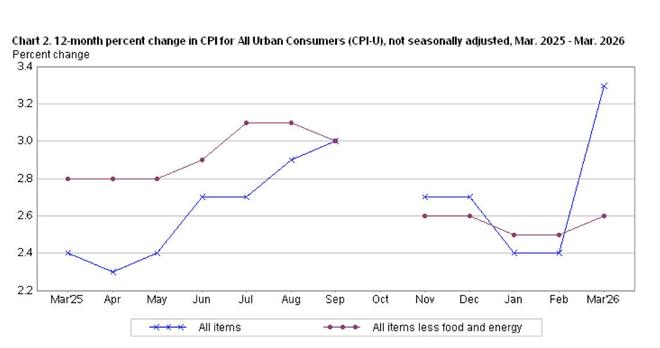 美国劳工部周五公布的数据显示,3月消费者价格指数(CPI)环比上涨0.9%,为2022年6月以来最大单月涨幅。同比上涨3.3%,为 2024年4月以来最高,较2月的2.4%明显回升。通胀数据主要受伊朗冲突影响,其中汽油价格暴涨21.2%,贡献了整体物价涨幅的近四分之三。