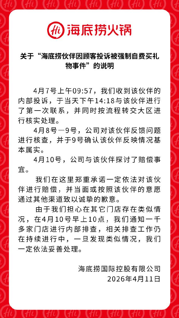 近日,海底捞员工因顾客投诉,被门店管理层强制自费购买礼物赔偿顾客,引发网友关注。4月11日下午6点,海底捞发布关于“海底捞伙伴因顾客投诉被强制自费买礼物事件”的说明。