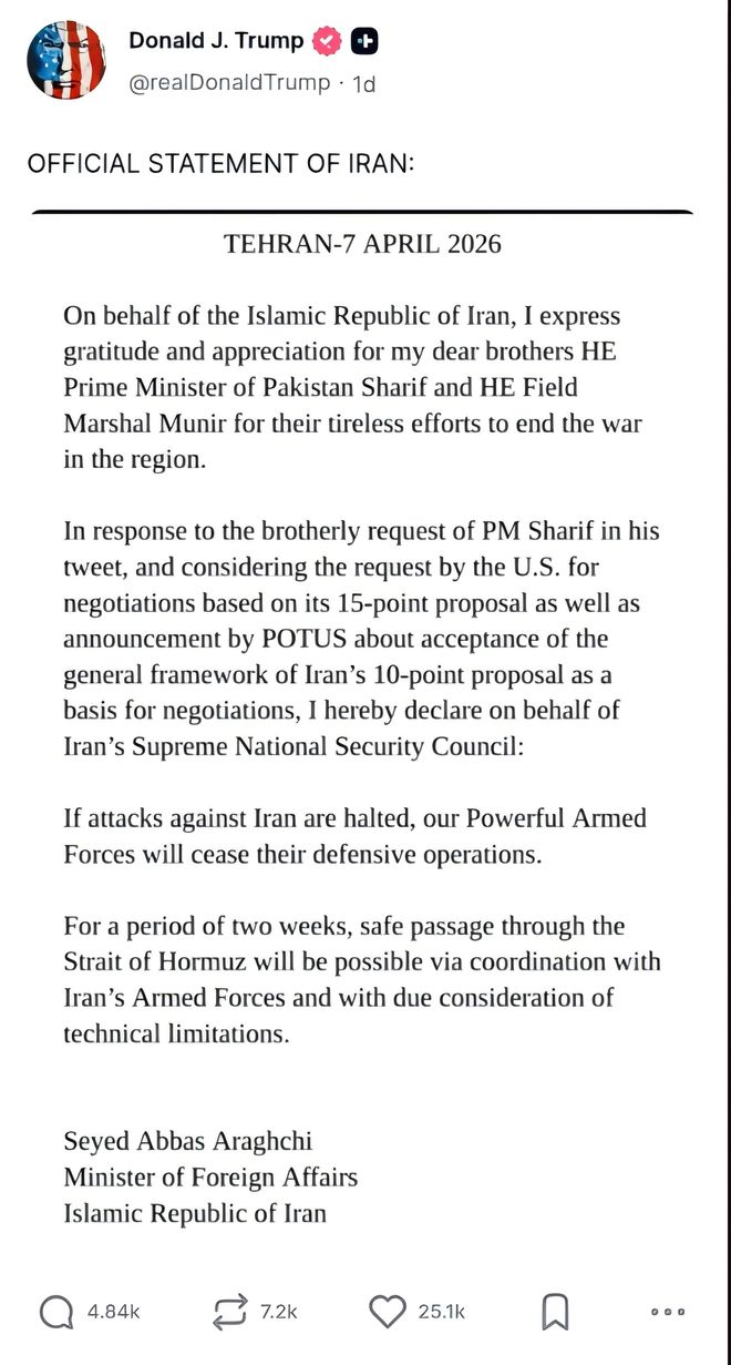 然而幸运的是,待到第二天大家伙儿起床的时候,大的没有来,波斯文明也暂时没有灭亡,反而是美国“拉”了。特朗普突然转发伊朗外长的帖子,宣布“收到了伊朗的‘十条计划’,这是一个好的谈判要求”。这种戛然而止的停战多少有点“意料之外、情理之中”,但也不算突兀——纵然特朗普内阁宫廷感十足,但美国也不是他的一言堂,他和他的内阁谁也没本事为爆破全球经济背锅。