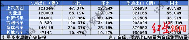 奇瑞汽车(09973.HK)、吉利汽车(00175.HK)、长安汽车3月的出口销量分别同比增长了220%、120%、108%,吉利汽车一季度出口销量同比增长了125.7%。