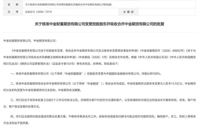 4月8日,中国证监会官网公布《关于核准中金财富期货有限公司变更控股股东并吸收合并中金期货有限公司的批复》。