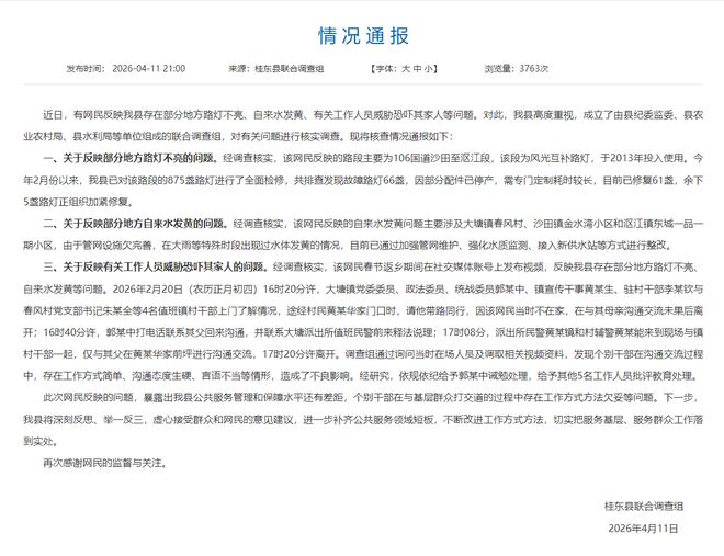 近日,有网民反映我县存在部分地方路灯不亮、自来水发黄、有关工作人员威胁恐吓其家人等问题。对此,我县高度重视,成立了由县纪委监委、县农业农村局、县水利局等单位组成的联合调查组,对有关问题进行核实调查。现将核查情况通报如下: