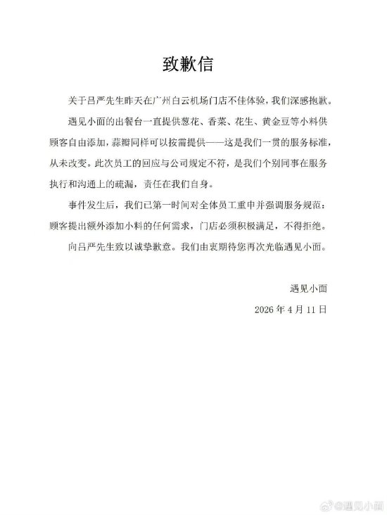 4月11日,遇见小面发布致歉信,对演员吕严吃面加葱花被拒一事回应。