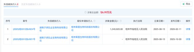 此外,该公司也出现多起诉讼纠纷。其中包括,广告服务合同纠纷、典当纠纷以及劳动仲裁等。截至目前,子承乳业生物科技公司已被列为失信被执行人,涉案金额约124万元。