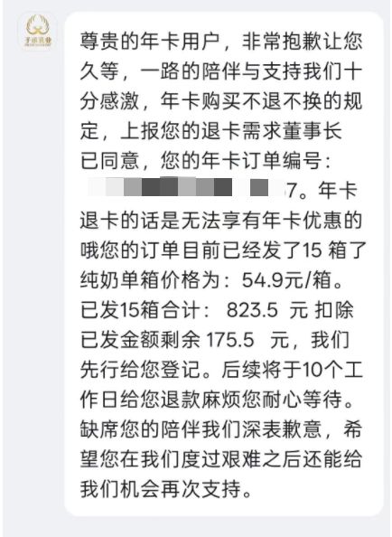 有着相同遭遇的还有安徽合肥的陈女士(化名)。2025年8月,她也在直播间购买了“子承乳业”的年卡,但5个月后便停止了发货。当陈女士找到售后客服要求退款时,对方表示,退卡无法再享受年卡的优惠价格,需按原价54.9元/箱结算(约为优惠价的3倍)。扣除已发货的15箱,只能退给陈女士175元。