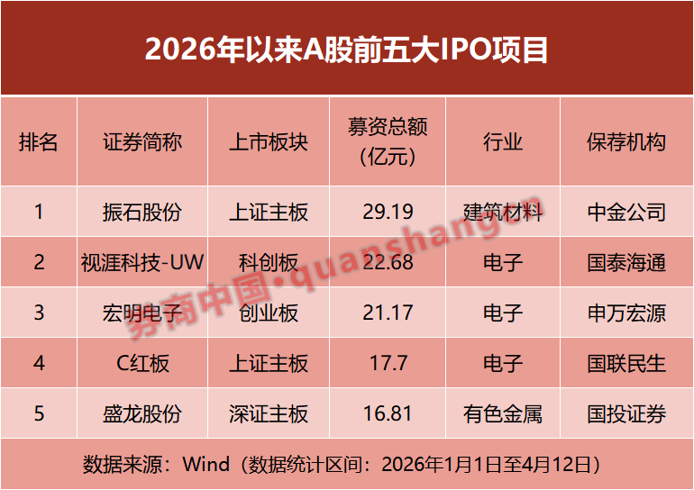 具体来看,年内前五大IPO项目分别为:振石股份(募资29.19亿元,中金公司保荐)、视涯科技-UW(募资22.68亿元,国泰海通保荐)、宏明电子(募资21.17亿元,申万宏源保荐)、C红板(红板科技)(募资17.70亿元,国联民生保荐)、盛龙股份(募资16.81亿元,国投证券保荐)。