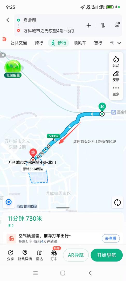 居民马先生告诉记者,以嘉会湖地铁站为起点,分别可以经由嘉秀东路、口小路及该条土路前往该片居住区。不过这条土路是距离最短的,因此尽管道路坑洼难行,还是有大量居民由此通行。记者注意到,打开导航软件以嘉会湖地铁站为起点、这些小区为终点,绝大多数推荐的步行路线都要经过该条土路。而经由其他两条道路步行要多走近500米,用时多5分钟左右。