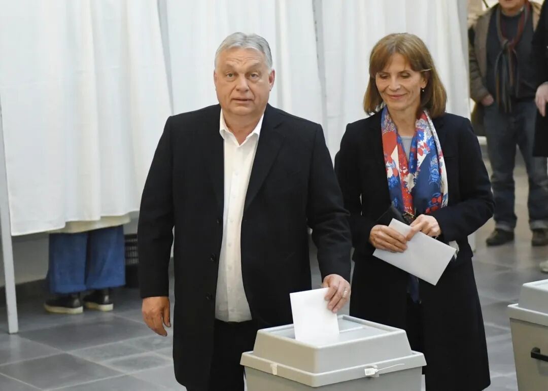4月12日,在匈牙利首都布达佩斯,匈牙利总理欧尔班(左)和夫人在一处投票站投票。新华社记者贺灿铃摄
