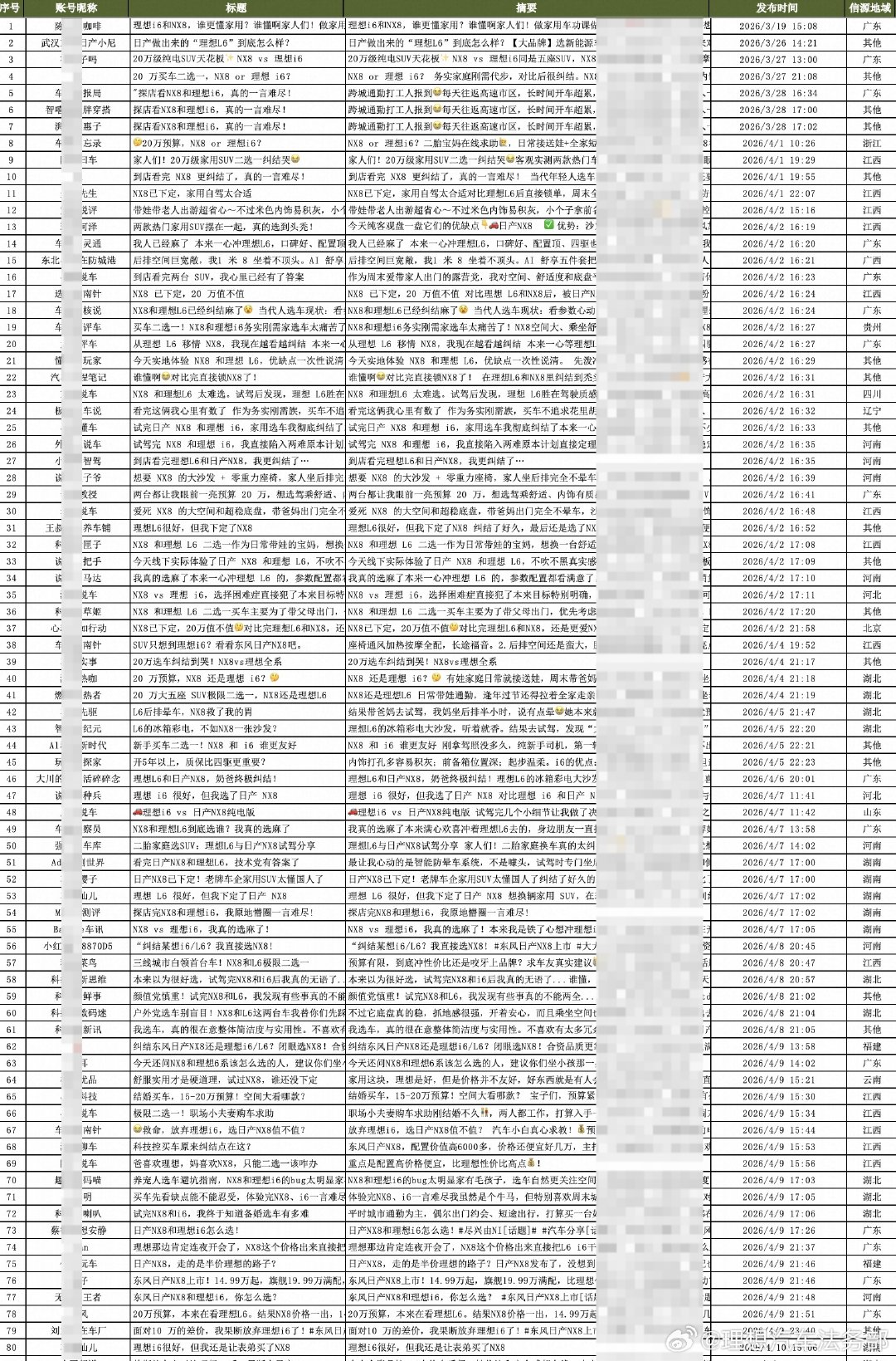 但理想汽车法务部直接晒出了社交平台评论区截图和统计信息。其称,在上周NX8上市后,网络平台上集中出现大量将理想i6、理想L6与NX8进行不当对比、恶意拉踩的贴文。这些内容大多以“买车二选一”为模板,高度同质化,且发文IP地址与发布时间异常集中,呈现出明显的组织化痕迹。