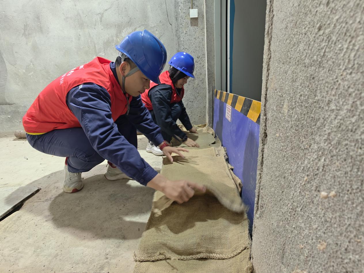 在辖区内易涝区域的配电站房,运维人员重点对站房防汛设施、排水系统、门窗密封性等进行 “拉网式” 排查,仔细检查防汛挡板、挡水条等设备完好性。针对汛期强降雨可能引发的倒灌风险,工作人员在站房门口规范铺设膨胀吸水袋,层层叠放、压实固定,筑牢防汛 “第一道防线”,从源头阻断雨水侵入,确保站房内电气设备不受水浸影响。