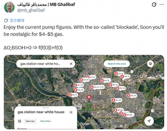 当地时间4月12日,伊朗伊斯兰议会议长卡利巴夫在社交平台发布了一张图片,图中显示了白宫附近加油站的油价。