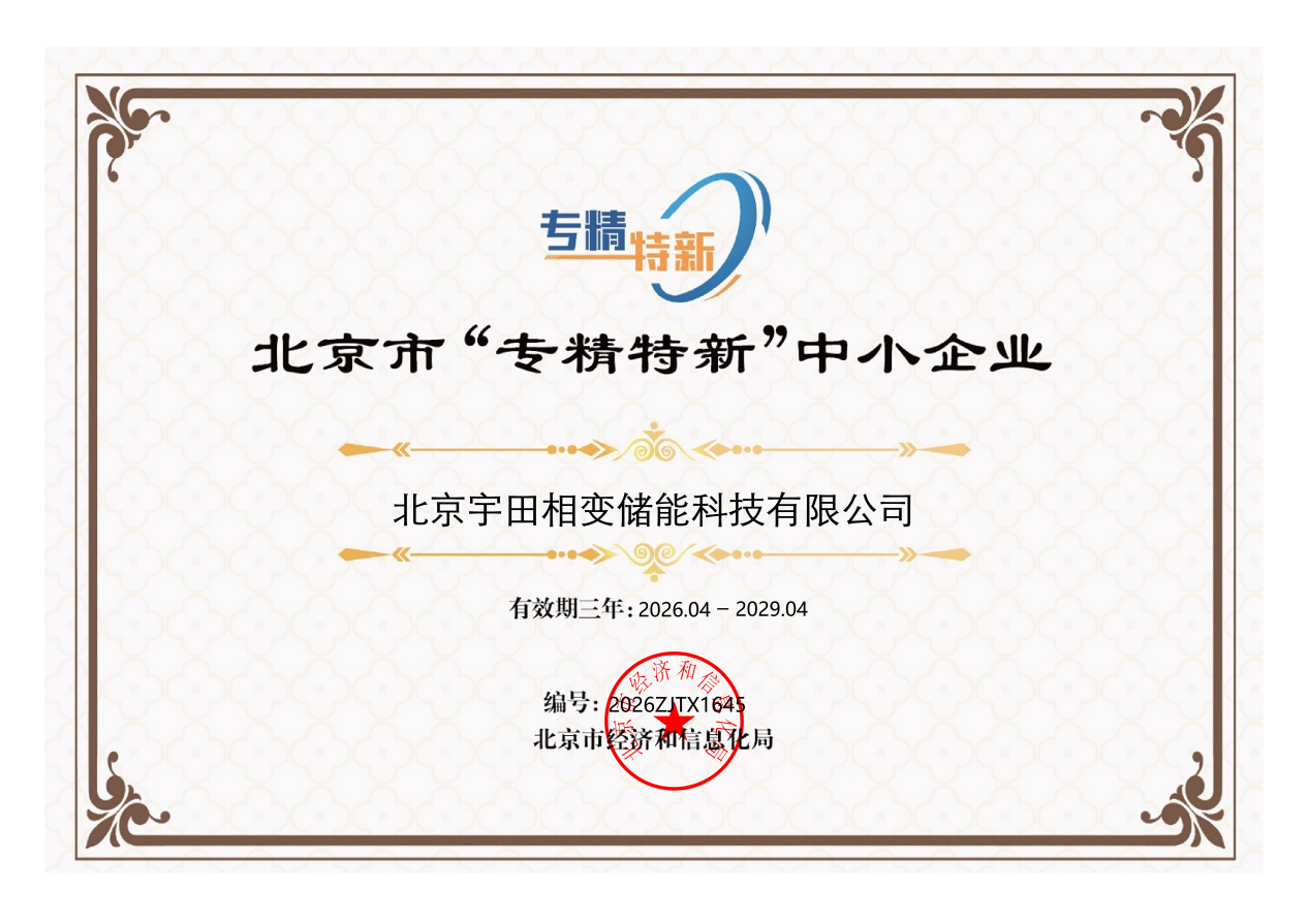 近日,北京市经济和信息化局正式公告2026年第一批北京市 “专精特新”中小企业名单,北京宇田相变储能科技有限公司(宇田储能)凭借在相变储能领域的专业化深耕、技术创新实力与精细化运营能力,成功入选,斩获这一权威认可!