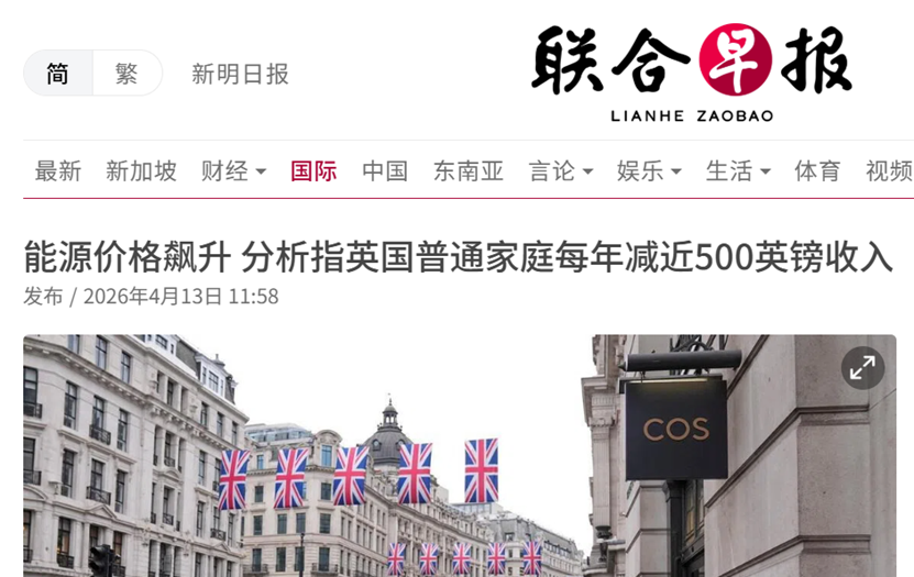 《联合早报》今日发文称,据彭博社报道,英国智库决议基金会于4月13日指出,根据市场对能源价格的预测,英国中位数劳动年龄家庭的收入在本财年将下降0.6%,而此前预期为增长0.9%。
