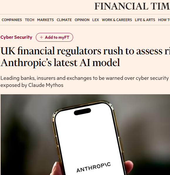 据金融时报4月13日报道,英国金融监管机构正与政府网络安全监管机构、该国大型银行日前展开紧急磋商,重点评估Anthropic最新AI模型Claude Mythos Preview带来的安全风险,预计两周内将向主流银行、保险公司和交易所警示其暴露的网络安全漏洞。