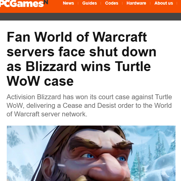 4月13日,据外媒 PC Games报道,近日,美国加利福尼亚地区法院就动视暴雪起诉Turtle WoW侵权一案作出判决,暴雪最终胜诉,法院向这款知名《魔兽世界》私人服务器网络下达立即生效的停止令,Turtle WoW的运营生涯或将画上句号。