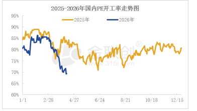 近期国内聚乙烯进入春检集中期,叠加部分企业受原油成本压力降负或停车避险,产能利用率持续下降。随着扬子石化、兰州石化、连云港石化、万华化学、中安联合和上海金菲多套装置相继停车检修。截至4月10日,国内聚乙烯产能利用率降至69.42%,较3月平均水平(78.43%)下滑9.1个百分点。