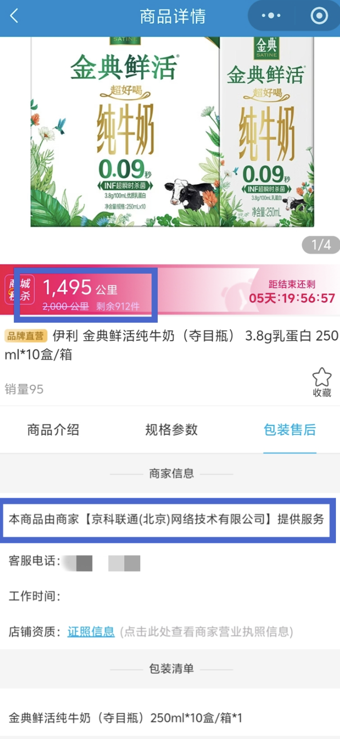 以一款标注了“品牌直营”的伊利金典鲜活纯牛奶为例,商品页面显示,该商品由京科联通(北京)网络技术有限公司提供服务。