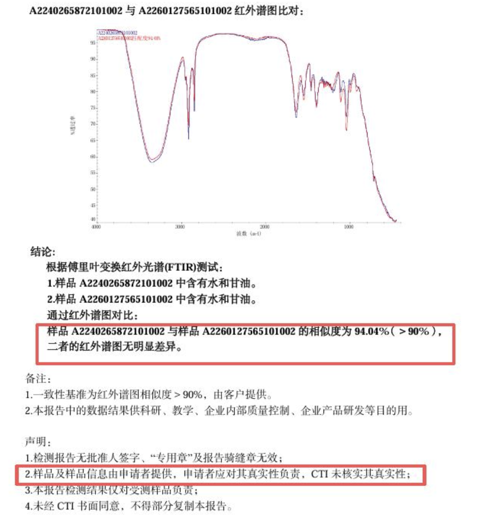检测报告显示,该检测机构对批次号为1058(鸣奇测试样)、7304(香奈儿官网样)的香奈儿洁面乳进行一致性对比,两者的相似度为94.04%,红外谱图无明显差异。