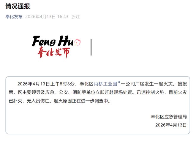 红星资本局4月13日消息,4月13日下午,宁波奉化区应急管理局发布情况通报称,上午8时3分,奉化区尚桥工业园一公司厂房发生一起火灾。接报后,迅速控制火势,目前火灾已扑灭,无人员伤亡。起火原因正在进一步调查中。
