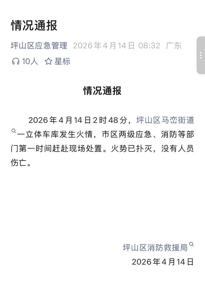 4月14日,坪山区应急管理发布情况通报:2026年4月14日2时48分,坪山区马峦街道一立体车库发生火情,市区两级应急、消防等部门第一时间赶赴现场处置。火势已扑灭,没有人员伤亡。