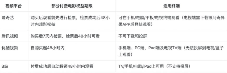 而这并非个别平台推出的规定。九派财经记者实测发现,爱奇艺、优酷、腾讯视频、B站等主流视频平台,均在付费电影购买界面中,以小号灰字标注“购买后48小时可看”或者“检票后48小时内无限次观看”、“购买48小时内支持在手机、电脑、平板、电视终端观看,48小时权益失效后用户则需要再次购买。