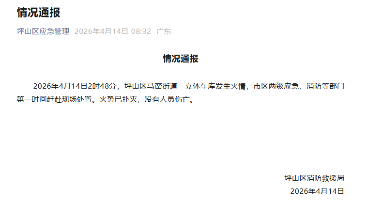 据“坪山区应急管理”微信公众号消息,4月14日,深圳坪山区消防救援局发布情况通报称,4月14日2时48分,坪山区马峦街道一立体车库发生火情,市区两级应急、消防等部门第一时间赶赴现场处置。火势已扑灭,没有人员伤亡。
